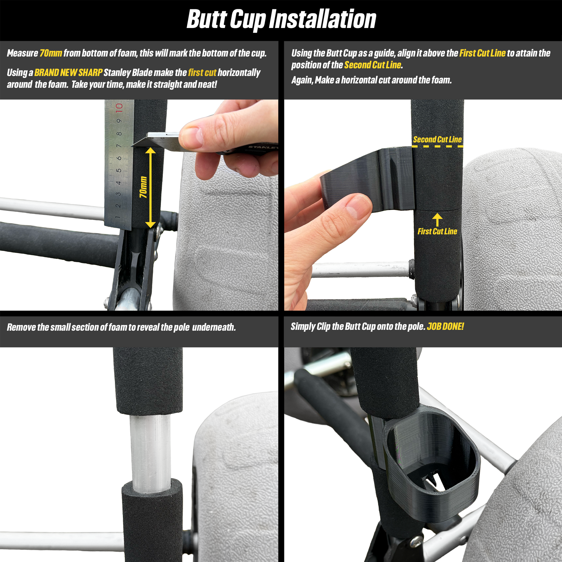 NOTE: To install the butt cup, the trolley foam will need to be cut accordingly. See pictures for more info. The 70mm measurement from the bottom ensures plenty of space to avoid the wheel.