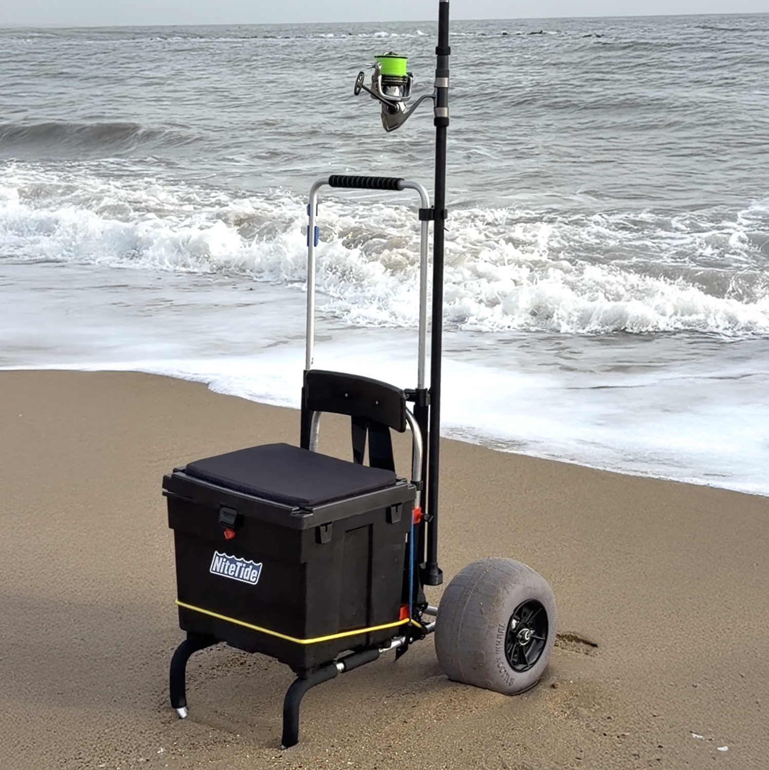 This makes moving with the tide much easier and eliminates the need awkward strapping or for a spare tripod or sand spike on the beach.