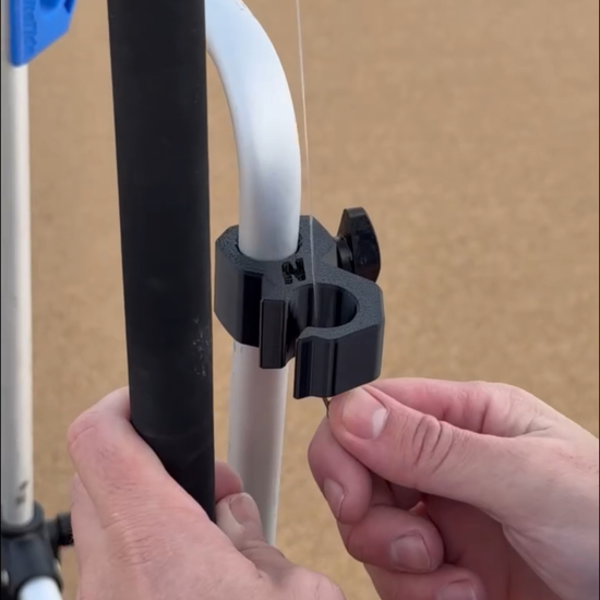 A top grip which clamps tightly to the trolley handle, the grip is flexible and will tightly hold a wide variety of rods. It also doubles as a handy way to trap end of the shock leader.